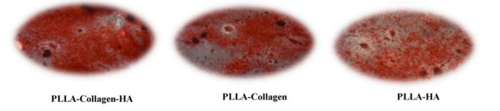 Image: Alizarin red staining at day 21 to visualise calcium-rich deposits in the three different scaffolds.