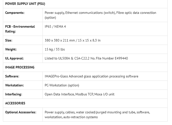 thermal imaging camera, thermal imaging, thermal imager, borescope imaging camera, fixed thermal imager line scanning, thermal imaging system, precision temperature monitoring, power supply unit, temperature monitoring, borescope, glass, borosilicate, container, float, optical display, specialty glass, fibre glass, melt furnace
