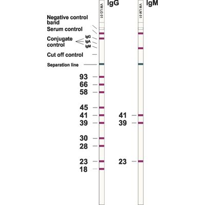 The Borrelia B31 ViraStripe® IgG and IgM tests are immunoassays for the qualitative detection of IgG and IgM antibodies against Borrelia burgdorferi sensu stricto B31 antigens in human serum. As line immunoblots based on nitrocelluose, the Borrelia B31 ViraStripe® IgG and IgM use purified specific antigens of Borrelia burgdorferi sensu stricto (strain B31, low passage, tick isolate). The Borrelia B31 ViraStripe® IgG and IgM Test Kits are composed of 50 nummerally sorted nitrocellulose stripes. The test procedure can be performed manually as well as on the common stripe immunoblot processors. The combination of the ViraCam® strip scanner and the ViraScan® software allows automated evaluation. Each strip offers maximum reliability through an integrated control system consisting of a negative control band, a serum control, three conjugate controls and a cut-off control.