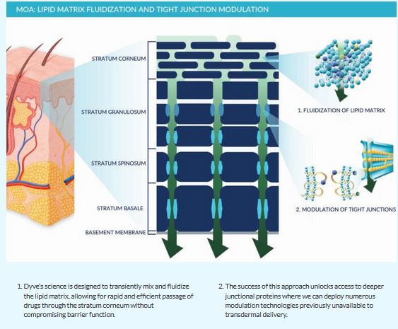 Current transdermal technologies often employ harsh solvents or complicated devices to break down the barriers of the skin resulting in skin irritation and damage with chronic use. Alternatively, Dyve has developed an elegant microemulsion, which transiently and reversibly fluidizes the lipid matrix and modulates tight junctions with topical application, allowing for non-destructive delivery through the skin and into the blood with uncompromised pharmacokinetics.