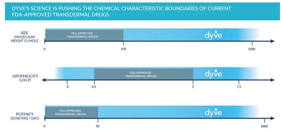 Dyve’s science shows the historic dogma of what can be delivered through the skin no longer applies. Successful delivery has been achieved with a wide range of molecules; the limit to what Dyve’s science can accomplish is yet to be defined.