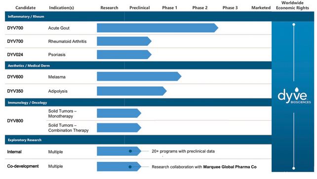 Dyve’s lead asset, DYV700, validates our platform technology and approach with existing POC data. In an initial randomized double blind placebo controlled trial, DYV700 provided patients experiencing gout flares with fast-acting relief that mitigated pain in minutes vs. days with the existing standard of care. Our pipeline includes Human POC data for 9 programs across three therapeutic areas that all utilize Dyve’s novel transdermal delivery approach.