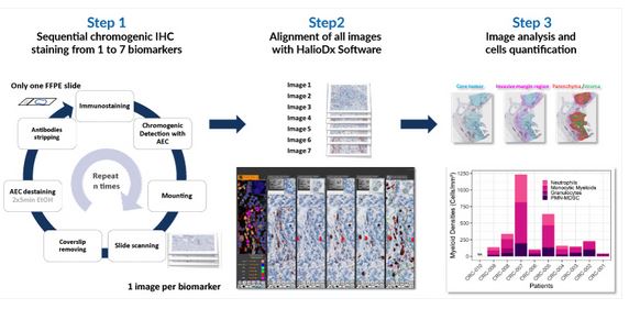 This customizable solution, a sequential chromogenic multiplex IHC, in addition with whole slide digital pathology analysis, allow to assess complex TME cells phenotyping on one FFPE tumor tissue section with up-to 7 biomarkers in order to provide valuable predictive and prognostic information, as well as insights on the underlying mechanisms of therapy response and resistance.
