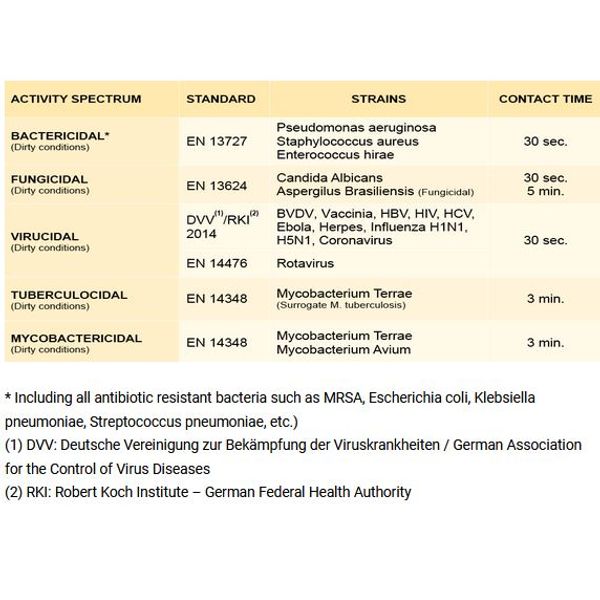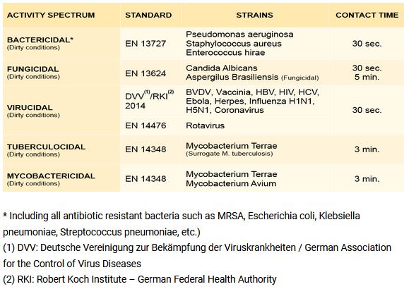 - Virucidal (HIV, HBV, HCV, Herpes, Vaccinia, BVDV, Influenza, Εbola, Coronavirus, Rotavirus…)
