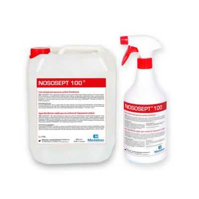 NOSOSEPT 100 is a broad spectrum antimicrobial disinfectant spray specially formulated for the rapid cleaning and disinfection of surfaces of medical devices. Active in 30 seconds, its use after each session prevents cross-contamination between patients. It is recommended for surfaces of medical devices in direct contact with patients and medical personnel such as trolleys, benches, examination tables, operating room furniture, etc. NOSOSEPT 100 has excellent disinfectant properties, a mild odor and leaves no residues after drying.