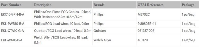 Performance equivalent to OEMs. One-piece Cables, Trunk Cables, Lead wires. Electrodes options: 4mm Banana, 3mm Needle, GE universal, Snap and Grabber. AHA/IEC code available. CE certificate and FDA 510(K) clearance. 6 months warranty.