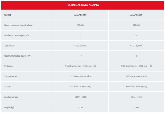ADAPTA 100 capsule filler can reach a speed of 100,000 capsules/hour. Beside excellent accessibility, the machine allows to dose up to 5 products into the same capsule thank to its exceptional design flexibility unrivalled on the market, with more than two hundred possible dosing combinations. Fitted with the 100% direct fill weight control. ADAPTA ensures maximum dosing precision and reliability even at filling products combination or for powder microdosing.