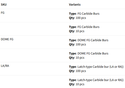 Premium quality carbide burs with higher concentricity, faster and smoother cutting and improved finishing. Each package contains 10 or 100 pieces. Contact us for the complete list of available shapes. Please contact us for complete availability of bur sizes.
