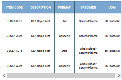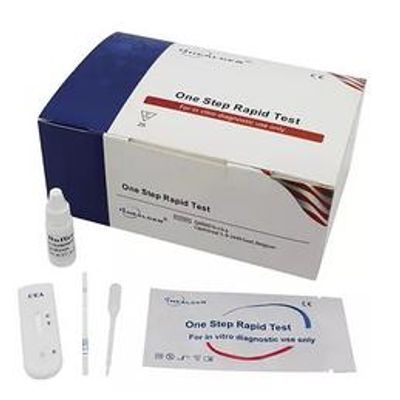 The CEA Rapid Test is a rapid chromatographic immunoassay for the qualitative detection of CEA in whole blood, serum or plasma. It is intended as an aid in the assessment and diagnosis of colorectal cancer and other types of cancer, such as pancreatic, stomach, breast, lung and certain types of thyroid and ovarian cancer. The CEA rapid test device utilizes a combination of colloidal gold conjugate and monoclonal antibodies to selectively detect elevated levels of CEA. CEA is present in high concentrations during fetal development, but ceases after birth. Therefore, it is not usually present in the blood of healthy adults. The normal CEA range for a non-smoking adult is less than 2.5 ng/mL and less than 5.0 ng/mL in a smoker.
