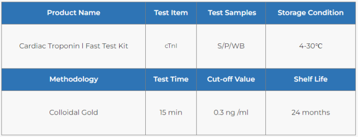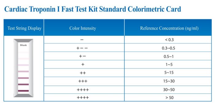 Cardiac Troponin l Fast Test Kit is intended for in vitro qualitative and semi-quantitative determination of cardiac Troponin l (cTnl) in serum, plasma or whole blood. This test is used as an aid in the diagnosis of myocardial injury such as Acute Myocardial Infarction (AMI), Unstable Angina, Acute Myocarditis and Acute Coronary Syndrome (ACS).