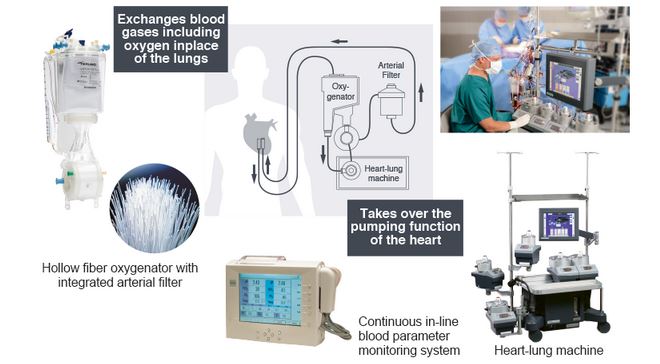 An oxygenator temporarily takes over the functions of the lungs, exchanging gases including oxygen and then returning oxygenated blood back to the patient via the cardiopulmonary bypass circuit.