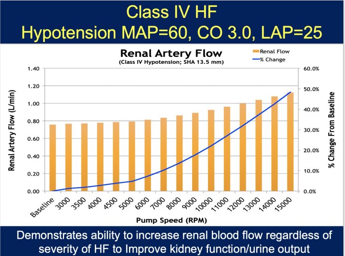 This slides shows even in Class IV advanced HF our device delivers increased flow with increased speed and the kidney will get the augmented flow vs vasoconstriction