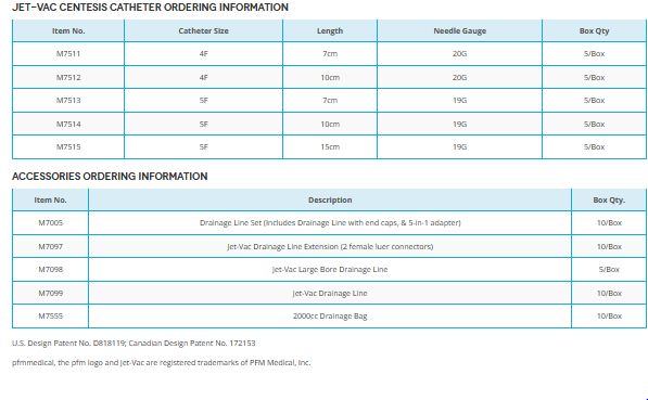 The Jet-Vac Centesis Catheters are built to provide safe and competent percutaneous drainage systems for both the clinician and the patient. PFM Medical’s Jet-Vac Catheters promote minimized procedure time through large side holes while increasing visualization placement under ultrasound with echogenic needles.