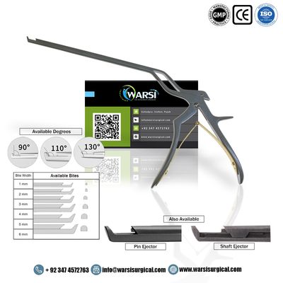 Ceramic BAYONET KERRISON RONGEUR. With and without ejector. Bit 130 Degree 90 degree Available up cut Bit Sizes: 1mm 2mm 3mm 4mm 5mm Shaft Sizes: B:18cm C:20cm More Details: Material: Medical Grade Stainless Steel Marking: (Brand name)(Hospital Name)(Surgeon Name). Guarantee: 1 year Return and Replacement year. Finishing: Stain finish/ Mirror Finish/ Sterile Colour Tunes. Minimum Order Quantity: 5 Pieces. Because these punches are used for spinal neurosurgical procedures and especially for Laminectomy. So Efficiently more bone tissue can be removed in a single step Bayonet Kerrison Available in three versions like non-detachable and detachable and detachable also coated.