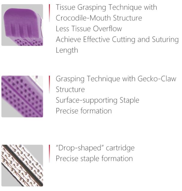 Typical type Disposable Endoscope Linear Cutting Staplers and Components Indicated for resection, transection and anastomosis of lung and bronchial tissues, stomach and intestine in open or endoscopic surgery.