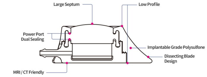 Patented Dual Sealing structures between the septum and the housing, keeping the port secure during power injection (maximum pressures 350psi for Standard Port and 300psi Mini Port)