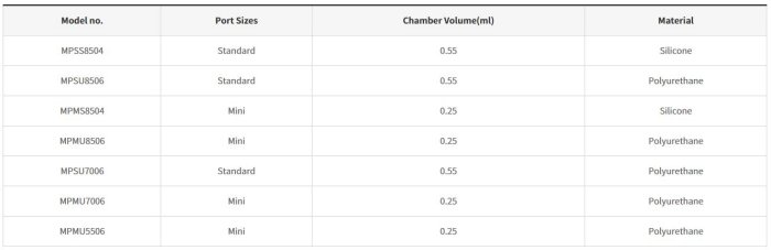 The port size(Standard, ,Mini)and the material of the catheter(Silicone, Polyurethane)is selectable 8.5Fr, 7Fr, 5.5Fr catheters are available for mini port