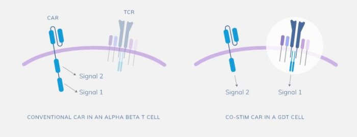 - If healthy cells are spared then the significant burden of treatment before and after CAR-T treatment can be dramatically reduced compared with conventional CAR-T. For example, healthy B cells can co-exist with a CD19-directed co-stim CAR-T.