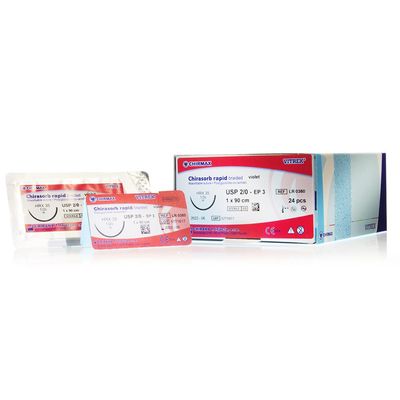 Chirasorb Rapid Braided Natural are intended for use in skin closure, paediatric surgery, episiotomies, circumcision, closure of oral mucosa and ophthalmic surgery for conjunctival sutures. Each pack contains 24 sutures except for lengths of 3m which have 20 sutures per pack. Different sutures variants can be seen on the "Suture Range" tab. If there is a suture you cannot find, please contact us and we will try and supply it for you.