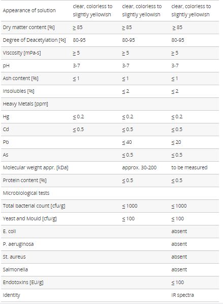 Properties of chitosan acetate: watersoluble, Applications. Wound dressings - improved wound healing of burns. The following table shows an overview of our chitosan acetate specifications: You can purchase small amounts of chitosan derivatives like chitosan acetate in our onlineshop. Minimum order quantitiy is 20 g.
