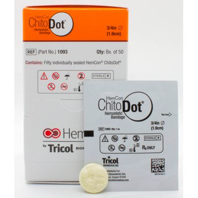 The HemCon ChitoDot is a chitosan-based bandage intended for local management of bleeding wounds. The HemCon ChitoDot provides rapid control of bleeding in patients following hemodialysis, and for those on anticoagulation therapy. ChitoDot also offers an antibacterial barrier against a wide range of microorganisms including antibiotic-resistant Staphylococcus aureus (MRSA), Enterococcus faecalis (VRE), and Acinetobacter baumannii. Product Dimensions: 3/4in; HPIS Code: 310-20-10-0; LATEX FREE. You must be a licensed dental/medical practitioner and/or represent a licensed dental/medical facility to order this product.