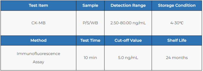 CK-MB Fast Test Kit (Immunofluorescence Assay) is intended for in vitro quantitative determination of CK-MB in human serum, plasma or whole blood samples. This test is used as an aid in the clinical diagnosis, prognosis and evaluation of myocardial injury such as Acute Myocardial Infarction (AMI), Unstable Angina, Acute Myocarditis and Acute Coronary Syndrome (ACS).
