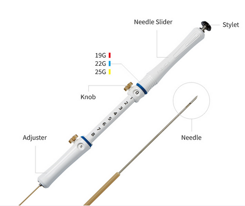 Spiral Echo Pattern: Well visible echo pattern on EUS image makes easy positioning of the needle. Needle [A Type] : The back-cut needle is designed for precise targeting and easy insertion into the lesion. [B Type] : Both back cutted bevel type to acquire more tissue with less handling.