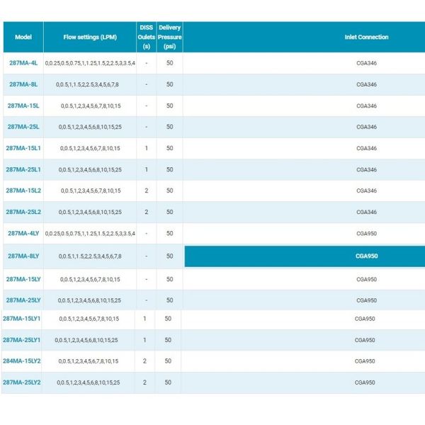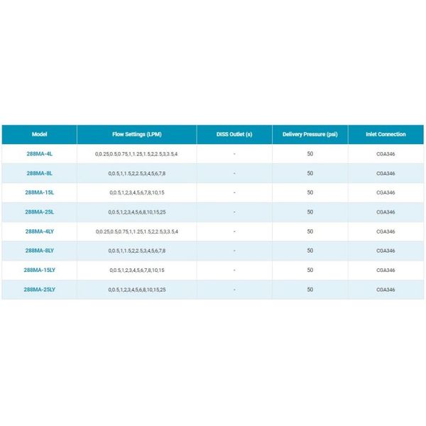 Features: Medical Air use. Aluminum body with brass high pressure chamber. 3000 psi maximum inlet pressure. 1-1/2” diameter UL-listed gauge. Complies to CGA standards. Internal relief valve. Hose barb outlet. Piston design regulator. Sintered bronze inlet filter for longer service life. Easy to read flow rate window. Available in 0-8L, 0-15L and 0-25L. Available in CGA 326 and 950.