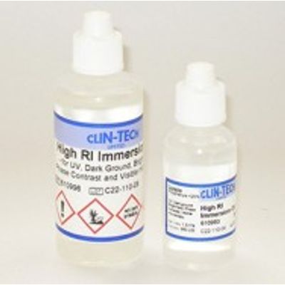 An immersion oil for microscopy, refractive index = 1.513 – 1.518. Contents: 30 mL immersion oil with a refractive index between 1.513 and 1.518 in a convenient dropper bottle for use at the bench. Clin-Tech Immersion Oil is also available in 60 mL dropper bottles and bottles of 100 and 500 mL for refill.