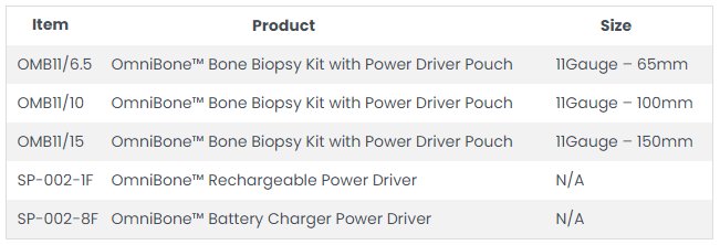 The OmniBone™ bone biopsy kit with Power Driver is available in 11 Gauge and three lengths (6.5 cm, 10 cm, 15 cm).