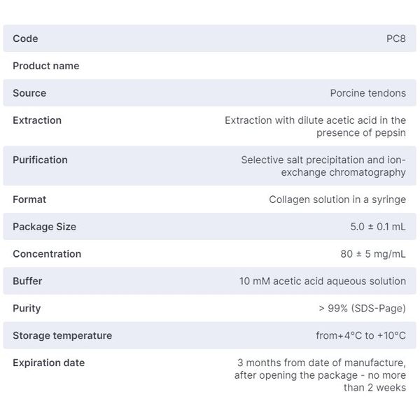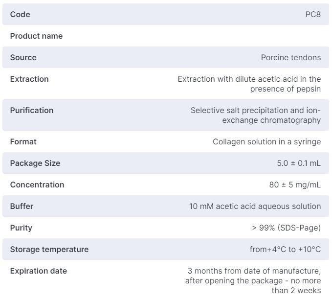 The product is a homogeneous viscous-fluid colloidal solution with a concentration of collagen type I of 80 mg/ml isolated from porcine tendons. This product is optimal for the practical training of students and graduate students in the process of 3D bioprinting using collagen. Or to test the performance of a given 3D printing protocol as part of validation procedures. Production time - up to 30 working days, Shelf life - 3 months, For research purposes only