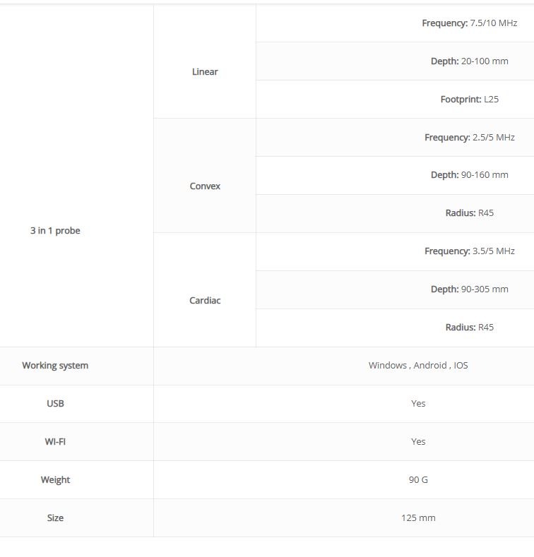 - Frequency: Convex probe: 2.5/5 MHz, Linear probe: 7.5/10 MHz, Cardiac probe, 3.5/5 MHz