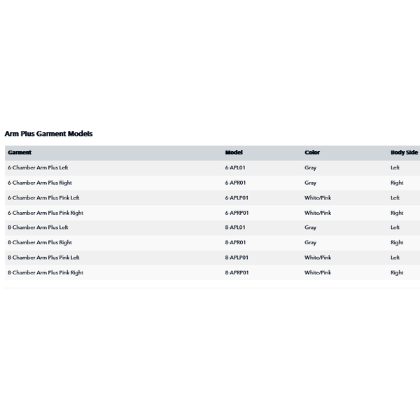 Arm Plus garments are available for the right arm/chest/shoulder or the left arm/chest/shoulder, and are available in two colors.
