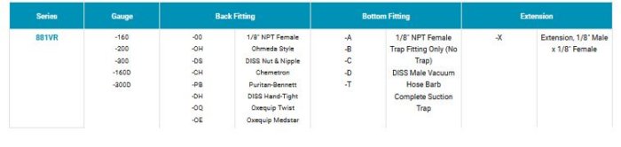 The 881VR Series Continuous/Intermittent (Combo) Suction Regulators provides both continuous regulated suction and intermittent regulated suction. This regulator is available in three regulated vacuum ranges: 0-160, 0-200, and 0-300 mmHg. Factory default setting for intermittent regulation is instant off, meaning the timer is set at 8 seconds OFF/ 16 seconds ON, reverse order available (see ordering information). The timer can be easily adjusted from the back of the regulator if necessary. A variety of inlet and outlet fittings are available to cover a wide range of customer needs. Gauges are dual scale (mmHg/kPa) and clockwise, but is also available in ISO styles (counter-clockwise).
