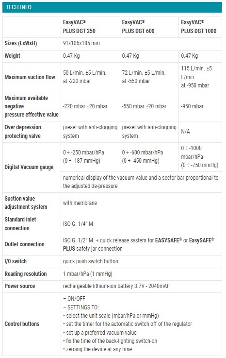 A protective silicone cover and a techno-polymer support prevent gauge damages caused by possible shocks received during transport or use. The EasyVAC® PLUS DGT digital vacuum regulators are manufactured with outlet threaded connection for screwing in the usual collection containers for suctioned fluids, or for direct connection to the EasySAFE® PLUS safety jar, through a specific quick release integrated connection. The use of the EasySAFE® PLUS safety jar is highly recommended to get a complete suction device able to guarantee total protection of the vacuum regulator and plant.