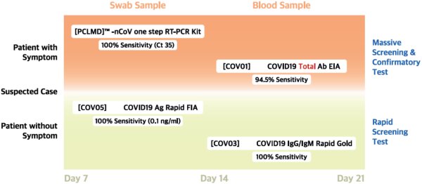 As a fact, we cover all cases needed for Covid-19 test via the following alternative options: Swab Sample, Blood Sample or Saliva Sample, Anti-gene or Antibody. High Sensitivity ranging from 94,5% to 99%, For Patients with symptoms and for people without symptoms. Our products have been tested and documented to highest levels in scientific publications and has already taken up the fight in the front line of the battle in Korea and Spain. We have gone for the best, so all our Premium solutions has Korean Origin and distinguish themselves by having short delivery times (1-5 days) or by being in stock. We look forward to finding the best solution for you and your country. Together we can overcome the challenge.