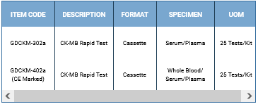 Creatine Kinase MB (CK-MB) is an enzyme present in the cardiac muscle with a molecular weight of 87.0 kDa. Creatine Kinase is a dimeric molecule formed from two subunits designated as “M” and “B” which combine to form three different isoenzymes, CK-MM, CKBB, and CK-MB. CK-MB is the isoenzyme of Creatine Kinase most involved in the metabolism of cardiac muscle tissue. The release of CK-MB into the blood following MI can be detected within 3-8 hours after the onset of symptoms. It peaks within 9 to 30 hours, and returns to baseline levels within 48 to 72 hours. CK-MB is one of the most important cardiac markers and is widely recognized as the traditional marker for the diagnosis of MI. The CK-MB Rapid Test Device (Whole Blood/Serum/Plasma) is a simple test that utilizes a combination of anti-CK-MB antibody coated particles and capture reagent to detect CK-MB in whole blood, serum or plasma. The minimum detection level is 5 ng/mL.