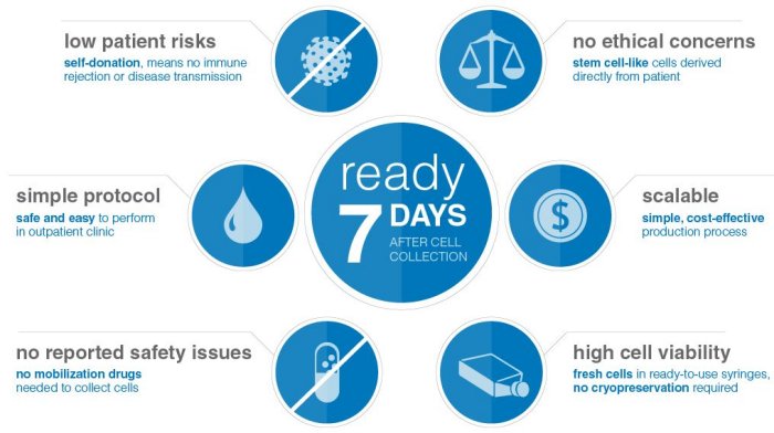 - Self-donor: Uses patient’s own cells, no immune rejection, no observed safety issues