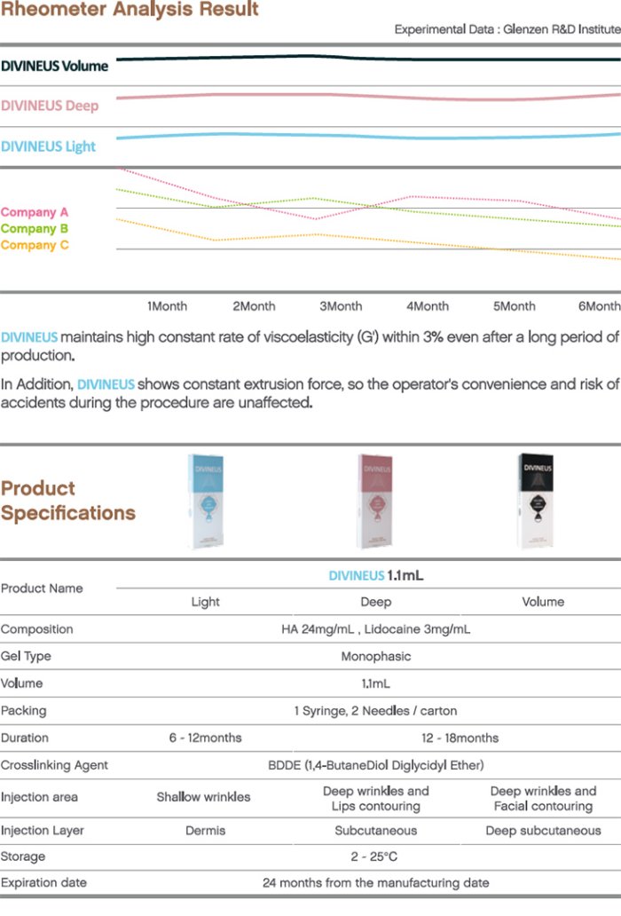 Cross-linked Hyaluronic Acid Dermal Filler, Accurate Treatment, Superior Quality, Superior Duration, High Safety. DIVINEUS maintains high constant rate of viscoelasticity (G1) within 3% even after a long period of production. In Addition, DIVINEUS shows constant extrusion force, so the operator`s convenience and risk of accidents during the procedure are unaffected.