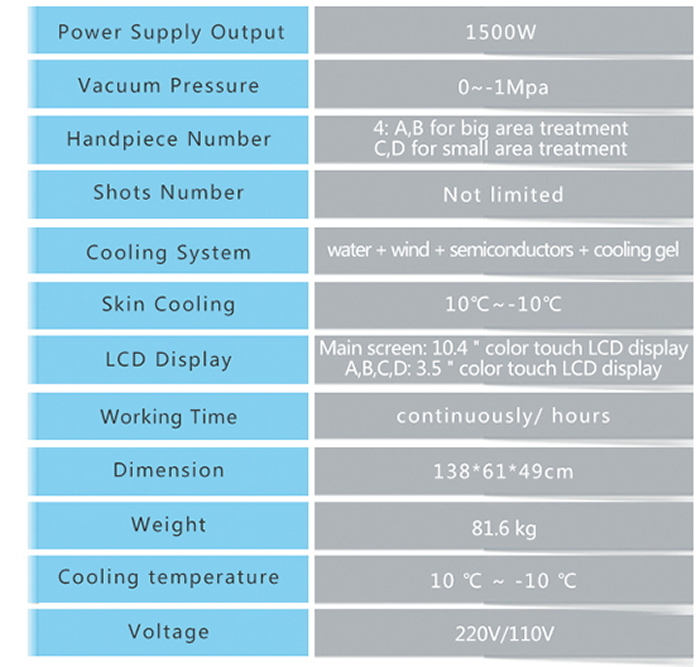 - Four freezing plates are added to this machine in consideration of the treatment area with smaller size,such as arms and shanks.