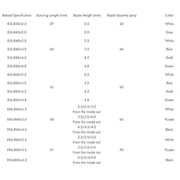 - Various specifications of staple reloads are available to meet different clinical needs.