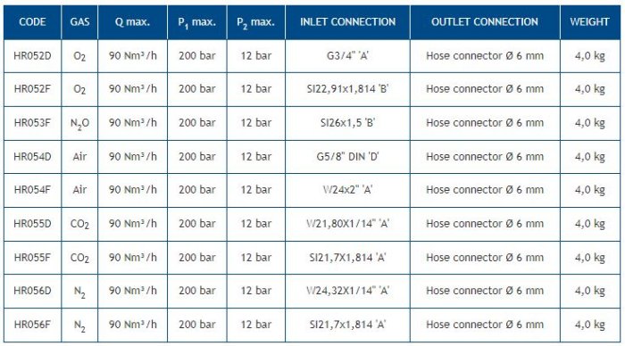 Pressure regulator for cylinders, suitable for medical gases, equipped with dual pressure gauge to show high and low pressure, used on the outlet of cylinders to reduce the pressure down to the line or equipment set.Maximum inlet pressure is 200 bar, the outlet pressure is adjustable up to 12 bar.The inlet connection is specific to the gas type, the outlet is fitted with an Ø 6 hose connector.Its maximum nitrogen capacity at 12 bar outlet pressure is 90 Nm³/h, 1500 Nl/min.