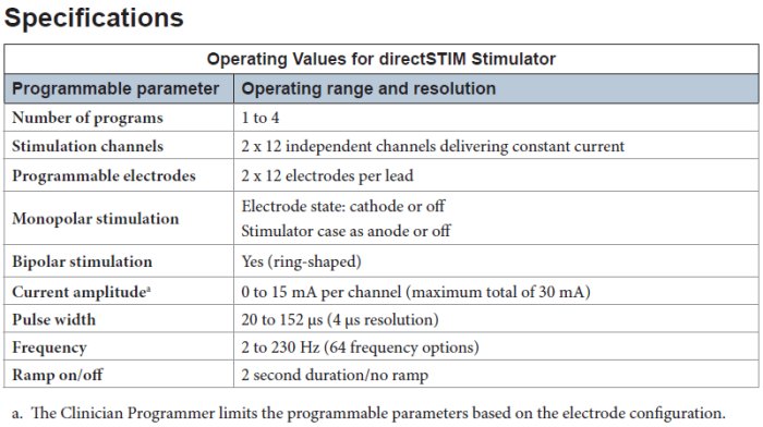 - directSTIM™ 24-Channel Implantable Pulse Generator Model 12000 (implantable stimulator) The implantable stimulator has two 12-channel connector ports. Each channel corresponds to an electrode on a lead. The implantable stimulator is rechargeable.