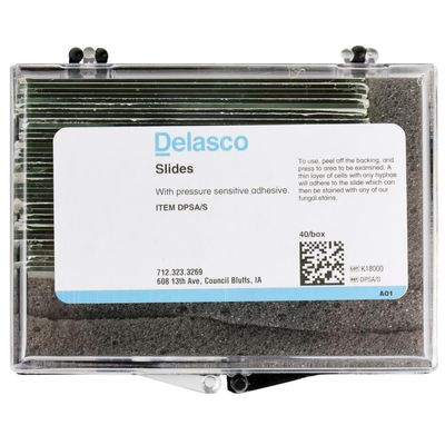 Pressure sensitive adhesive is applied to slides making ready-to-use pre-coated slides with peel-off backing. To use, peel off the backing, and press to area to be examined. A thin layer of cells with any hyphae will adhere to the slide which can then be stained with any of our fungal stains. Box of 40 slides. Delasco Slides with Pressure Sensitive Adhesive do not require a MSDS due to it either being inherently non-toxic or is non-toxic in the form, concentration or quantity supplied by Delasco.