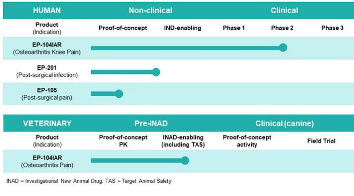 Our patented technology is designed to be tailored to a wide variety of drugs and therapeutic indications. In addition to our lead drug candidate (EP-104IAR), Eupraxia is currently developing an extended-release post-surgical anesthetic (EP-105) and antibiotic (EP-201). Eupraxia hopes to add 1-2 additional candidates to our pipeline within the next year, including an internally developed oncology product.