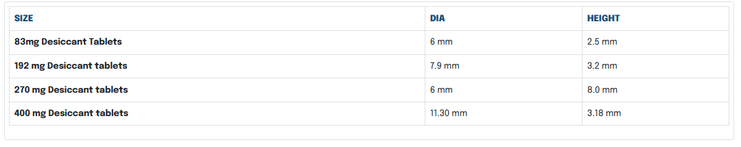The desiccant tablets are made from a unique blend of amorphous silicon dioxide, kaolin (clay), and aluminum oxide, which provides excellent moisture-absorbing properties. They are light tan in color and odorless, making them suitable for use in a variety of packaging applications.
