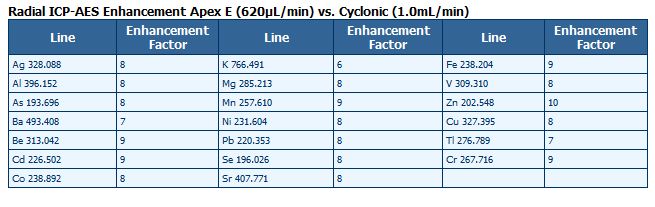 Low cost unit primarily designed for ICP Emission systems. The sample path is made from Pyrex and temperature settings of the heater and chiller are fixed. ICP-AES detection limits can be improved by up to a factor of 6-10 when operating at 1 ml/min using a MicroFlow PFA-ST or PolyPro-ST nebulizer together with the Apex E. Alternatively, the combination of a low flow nebulizer with the Apex E maintains ICP-AES sensitivity while reducing sample consumption by a factor of 5 to 10, improving ICP-AES determinations when the volume of sample is limited.