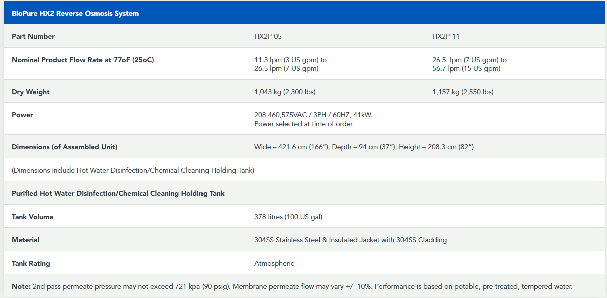 Mar Cor Purification offers the next generation central RO unit, the BioPure HX2. This direct feed double pass reverse osmosis system is designed specially to meet stringent international hemodialysis water requirements. The BioPure HX2 cental dialysis water system ensures the highest water quality, while the added feature of automatic hot water disinfection simplifies the bacteria control process.
