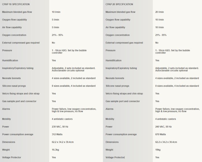- CPAP 20, twin flowmeters for up to 10 l/min oxygen and 10 l/min medical air