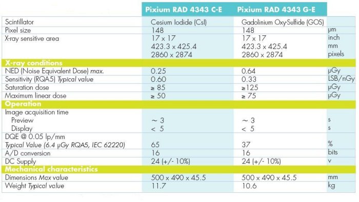 - Cutting-edge technology: Thanks to excellent production capabilities Pixium RAD 4343 C-E and Pixium RAD 4343 G-E detectors feature both CsI and GOS scintillators. These state-of-the-art technologies provide the highest quality solutions at an accessible price.